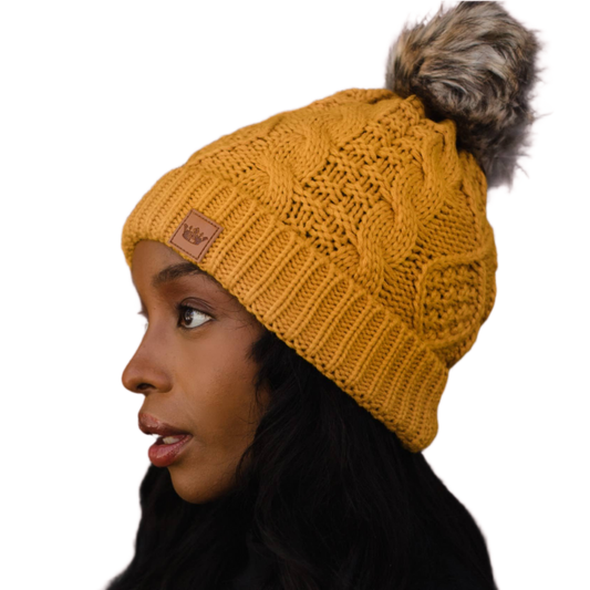 Mustard Cable Knit Pom Hat