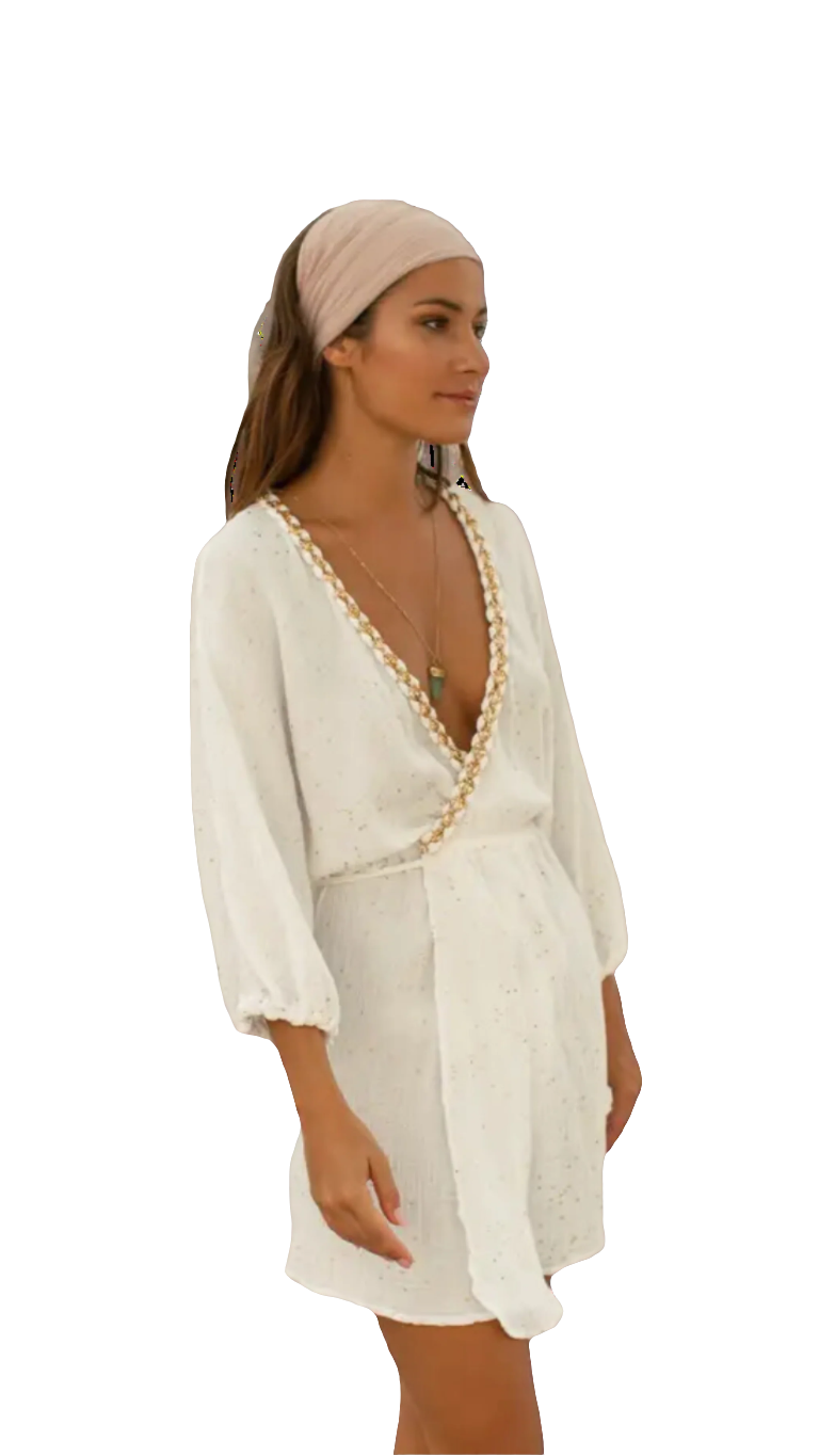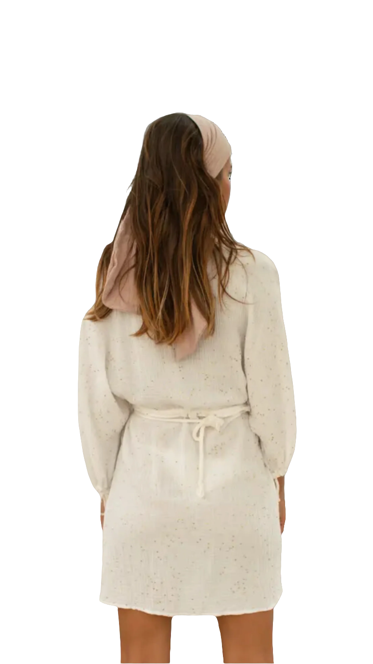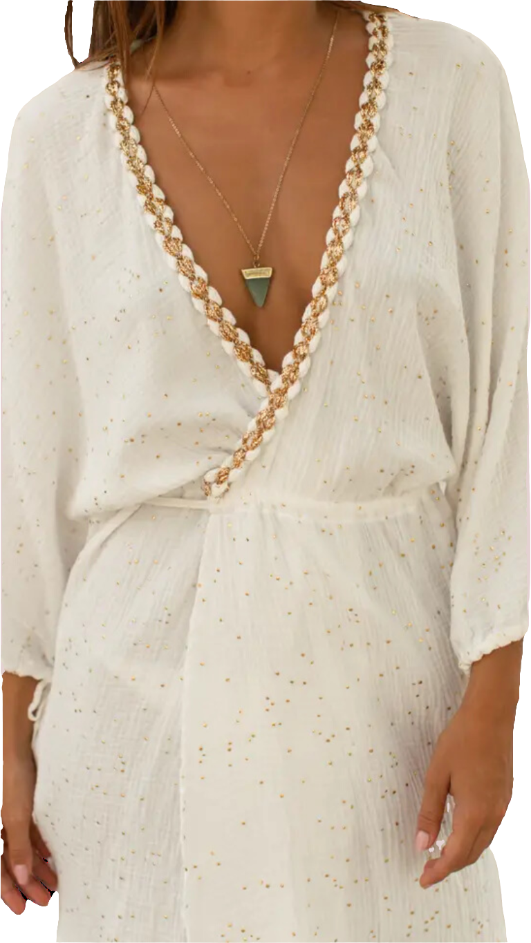 Kimono Wrap Batista dress with gold print 100% cotton. Throw on over a swimsuit or for a evening out on vacay.