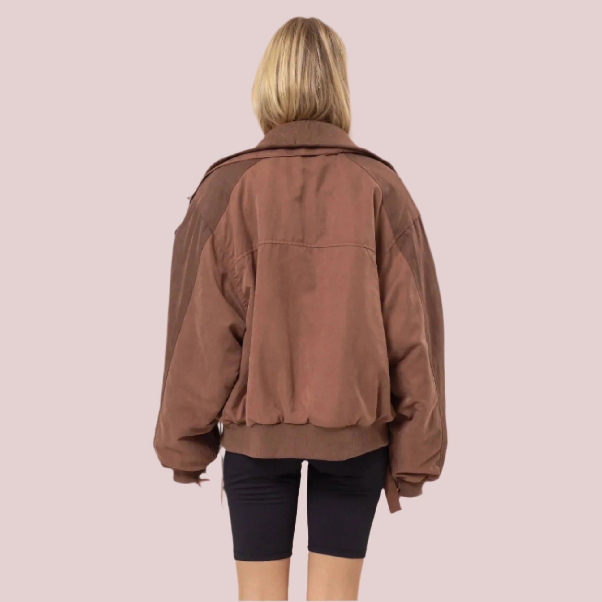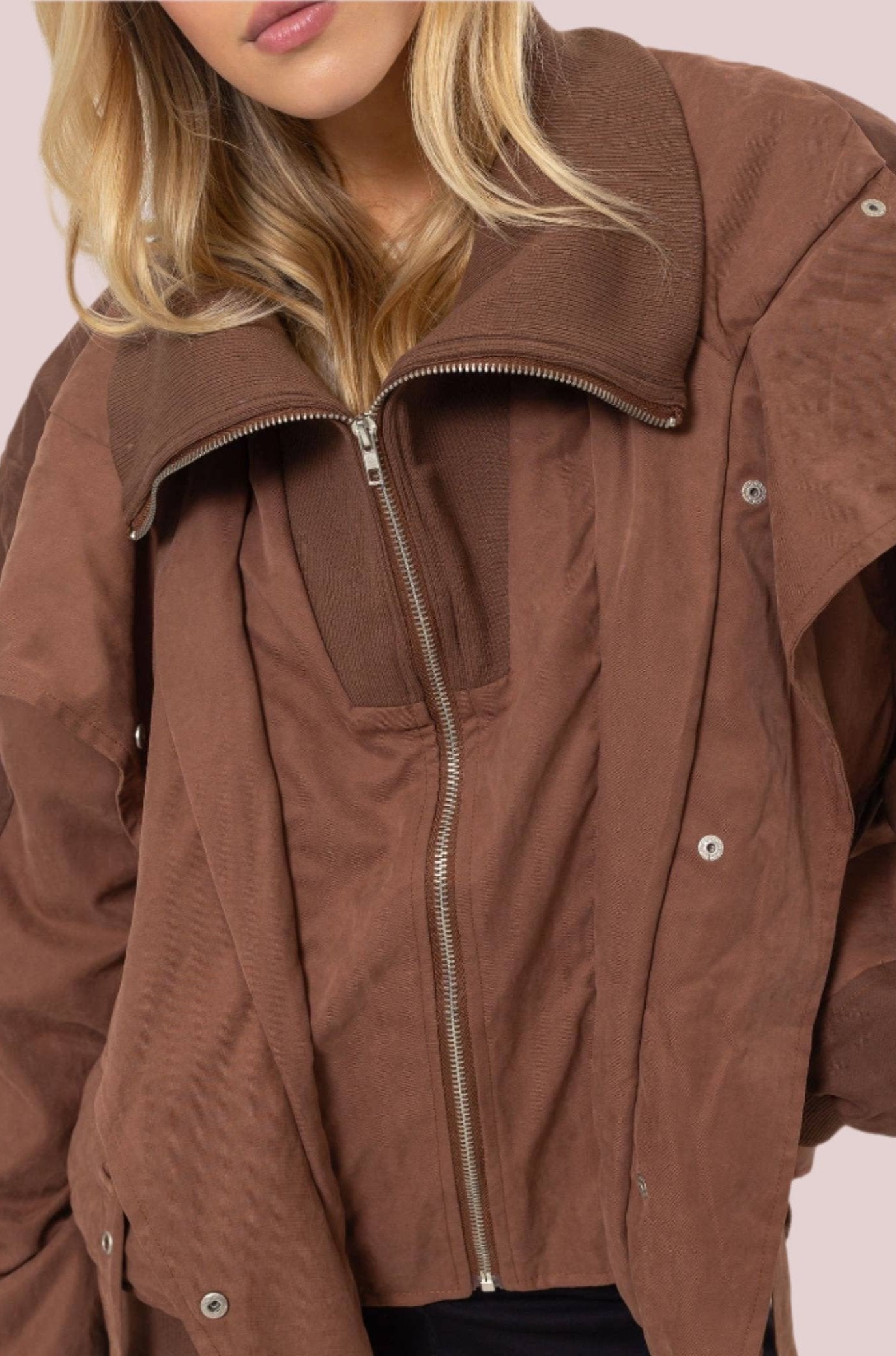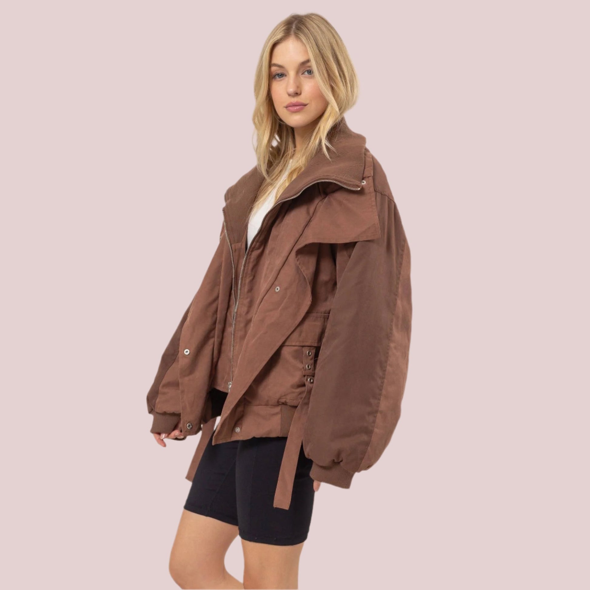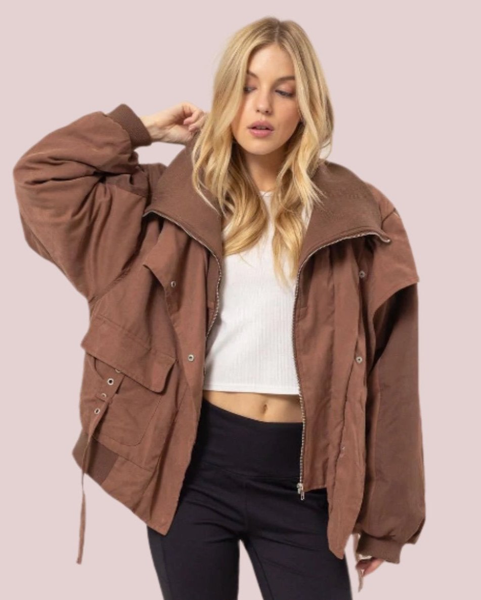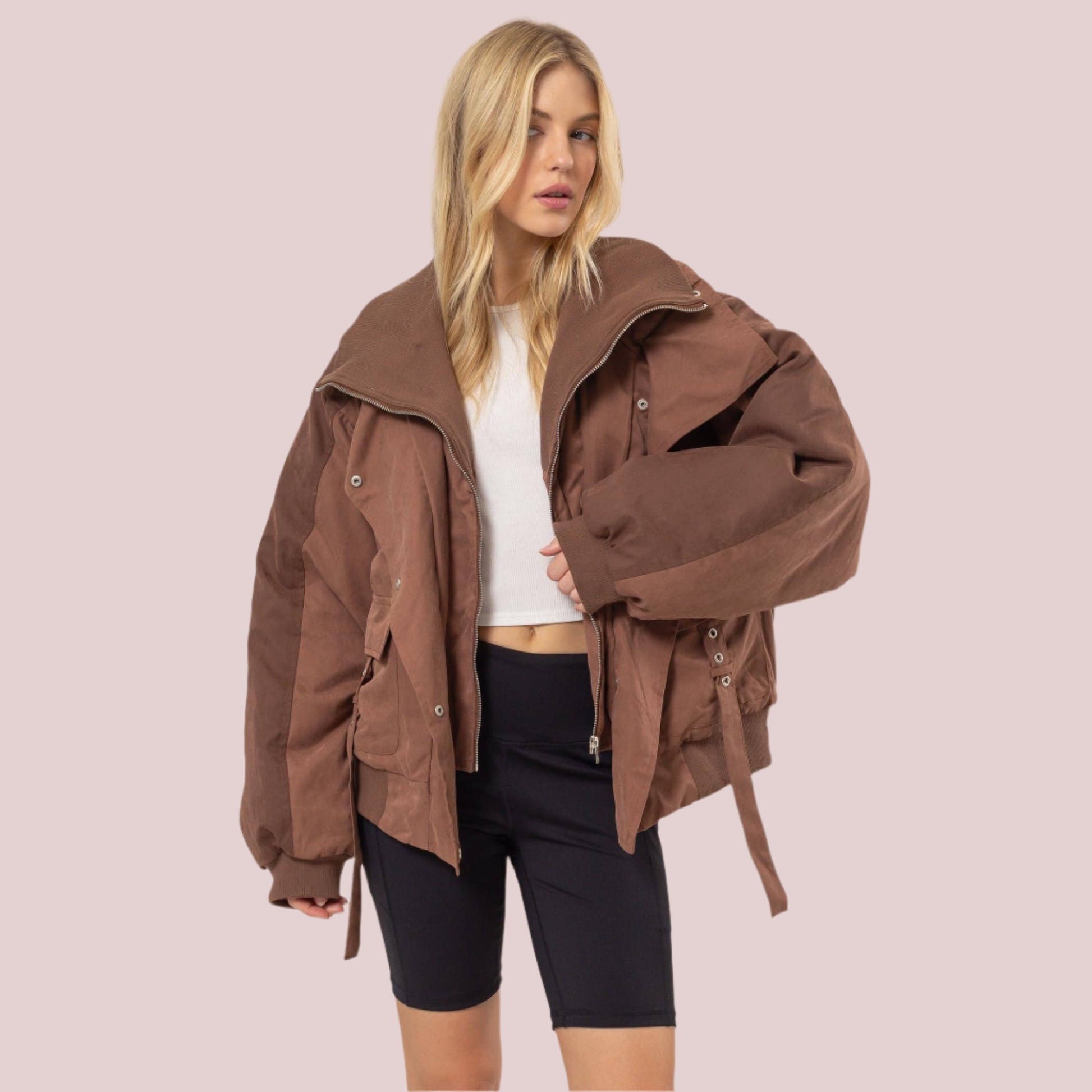 This puffer jacket is a modern outerwear option. It features a high neck, contrast long sleeves with drop shoulders, flap pockets with metal eyelet straps. This stylish number boasts a convenient zipper front along with a hidden button placket.