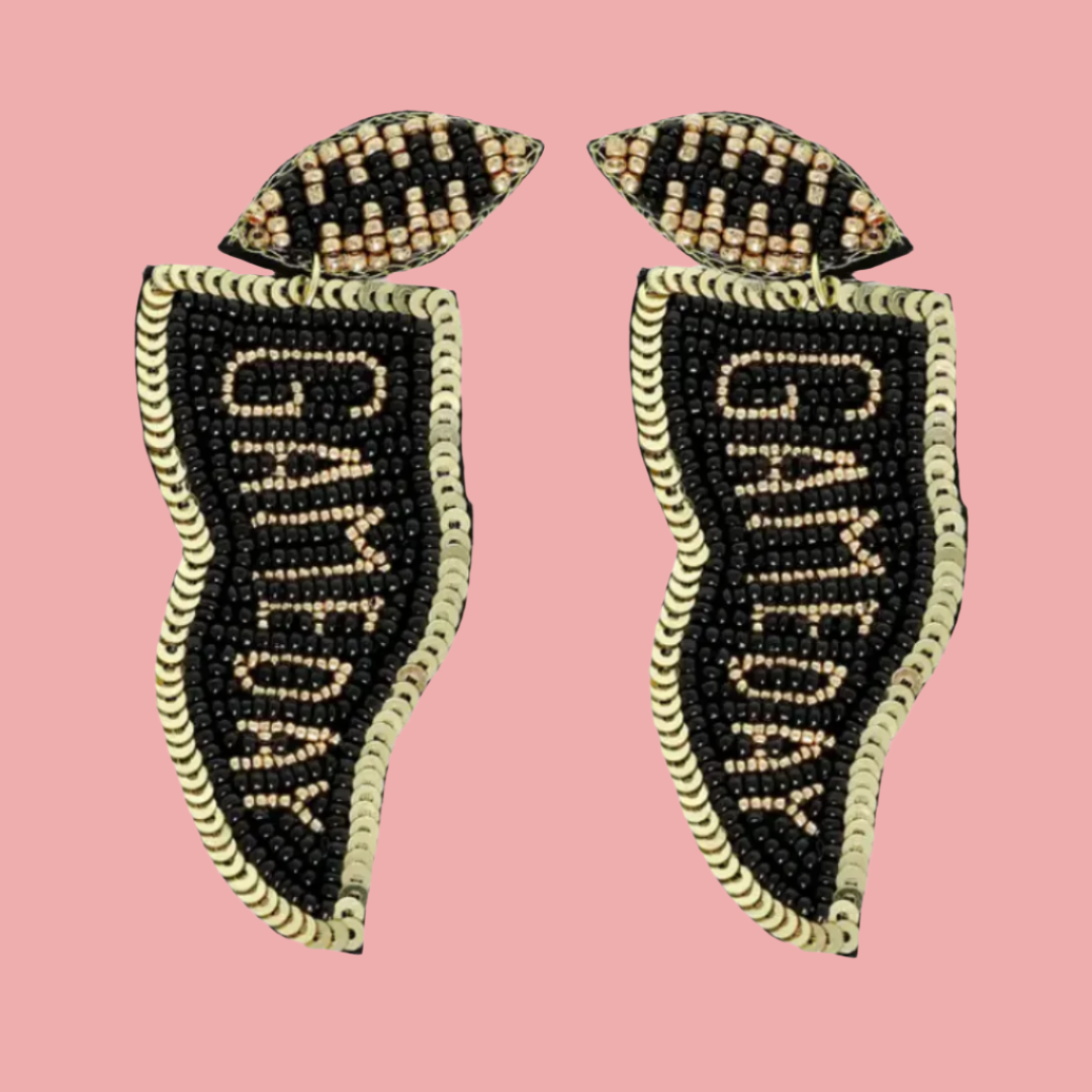 Add a touch of sparkle to your game day ensemble with our Game Day Letter Beaded Sequins Flag Post Earrings. These earrings feature a fun and unique design that shows off your team pride, making them the perfect accessory for any game day outfit. Made with high-quality materials, they are comfortable to wear and will last for all your future game days. Strike the perfect balance between fashion and fandom with these stylish earrings. HEIGHT: 3.75" WIDTH: 1.4"
