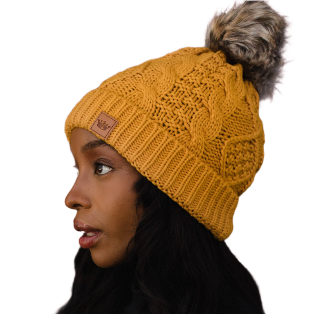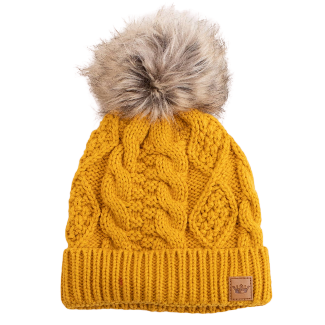 Stay warm and stylish this winter with our Mustard Cable Knit Pom Hat! This hat features a cozy fleece lining and a natural faux fur pom accent. Stay on-trend and keep your head toasty with this quirky and fun accessory.