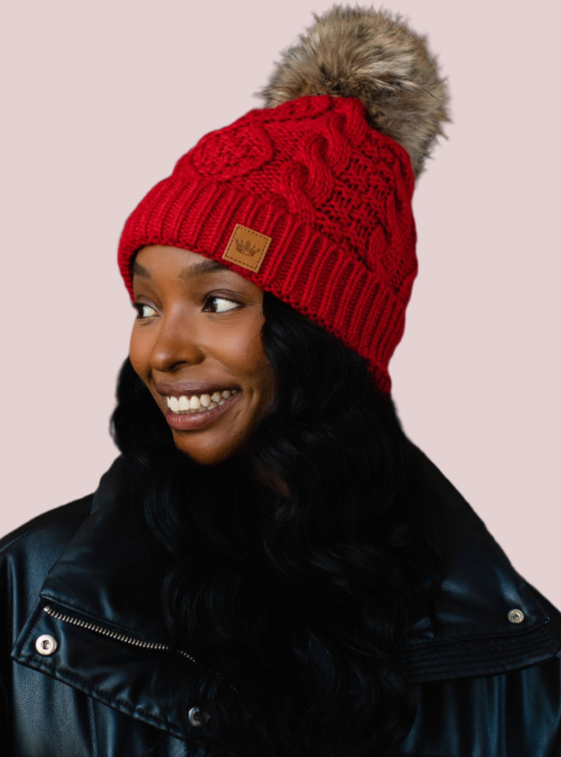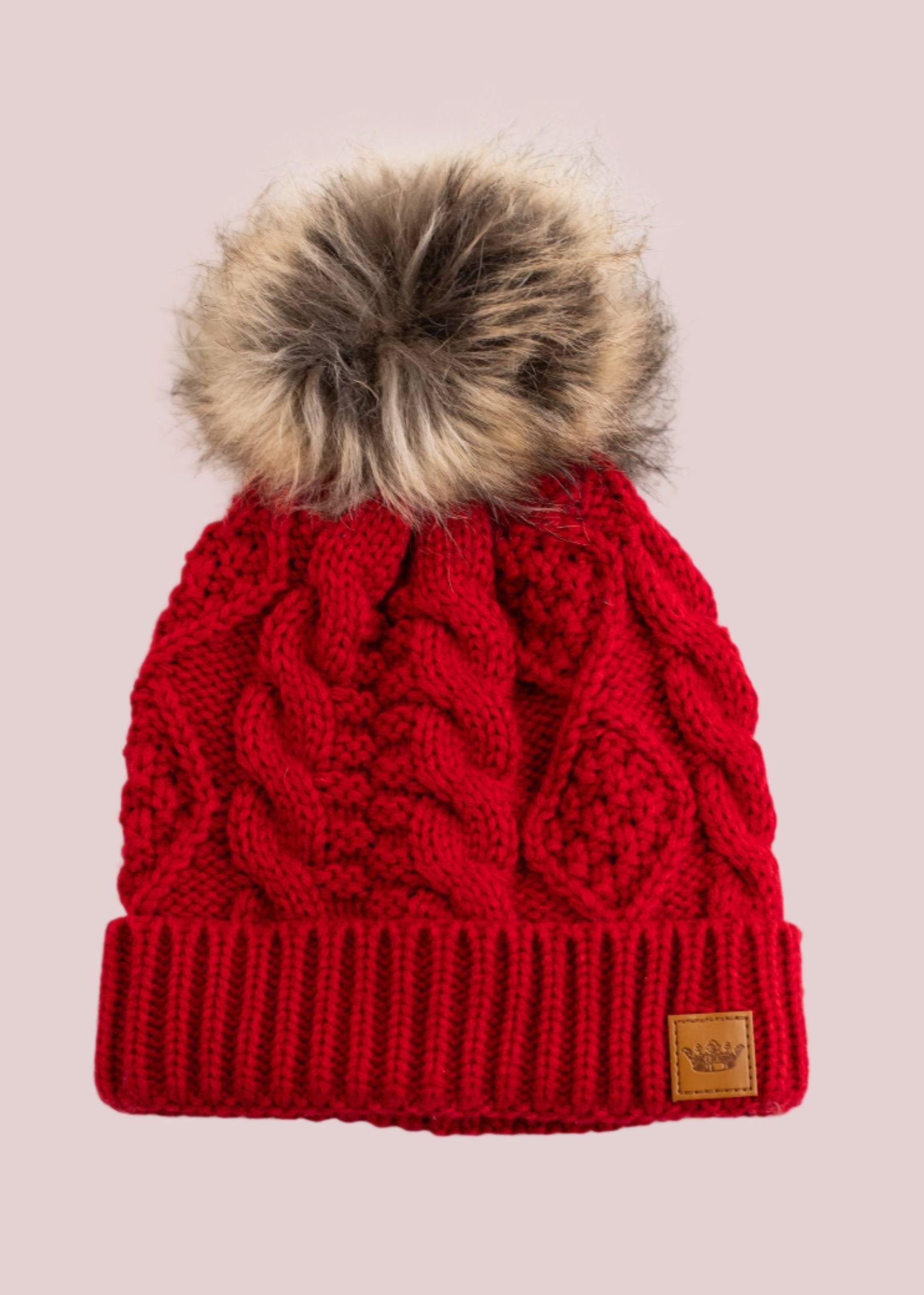Snuggle up in style with our cozy Red Cable Knit Pom Hat. Lined with soft fleece and topped off with a playful faux fur pom, this hat is sure to add a touch of whimsy to your winter wardrobe.