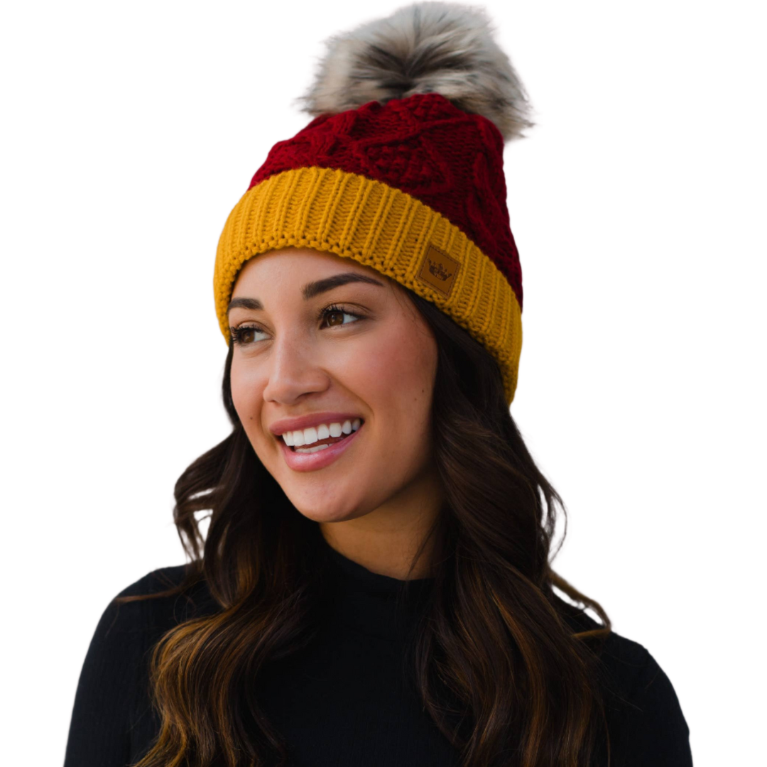 Get game-day ready with this Red & Gold Trim Cable Knit Pom Hat. Keep warm in style as you root for the Chiefs with its natural faux fur pom accent and fleece lining (toasty!).